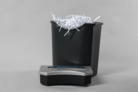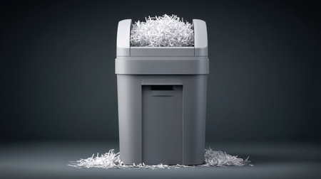 A modern gray paper shredder overflowing with shredded paper stands in a dark studio, highlighting the importance of document security and efficient organization in the workspace.