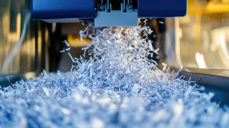 A close-up view of shredded paper flowing from a modern shredder, illustrating the importance of secure document disposal in both corporate and personal settings.
