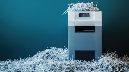 A modern document shredder is filled with shredded paper, sitting amidst a pile of waste. The green background accentuates the clutter, highlighting efficient waste management in an office setting.
