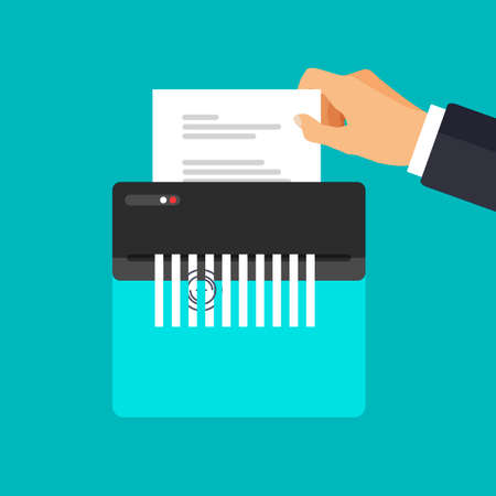 Paper shredder machine icon. Broken or torn confidential and private document. Hand holds contract. Vector Illustration.