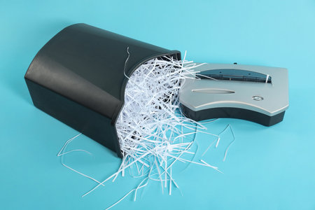 A modern paper shredder sits on a blue surface, with shredded paper spilling out, symbolizing efficient document disposal and office organization solutions.