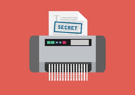 Shredder cutting paper. Modern device for safe destruction confidential documents shredding and processing of classified information concept financial vector data protection.