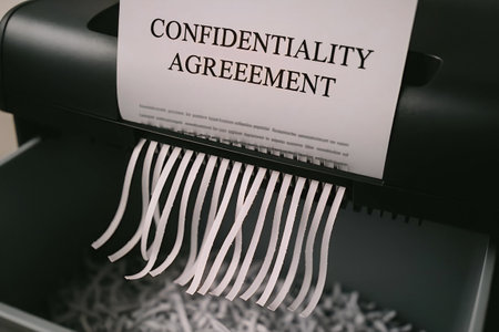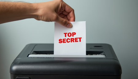 Over-the-shoulder POV capturing the moment sensitive, confidential business documents are securely d