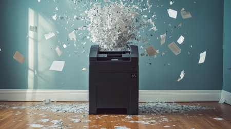 An energetic burst of flying papers and shredded confetti surrounding a sleek black shredder.