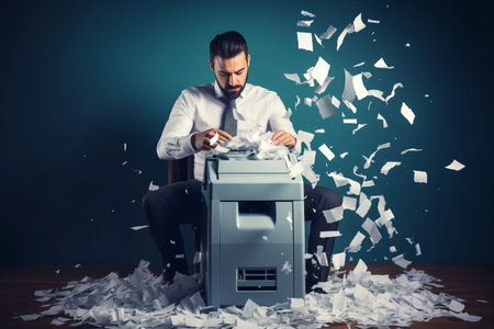 Modern office printer overwhelmed with a mess of shredded paper overflow