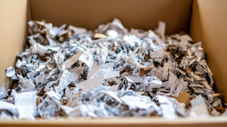 A close-up view of shredded paper inside a cardboard box, ideal for use as packing material or recycling. This image captures the essence of eco-friendly storage and waste reduction perfect for creative projects or office organization.