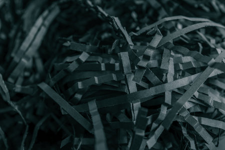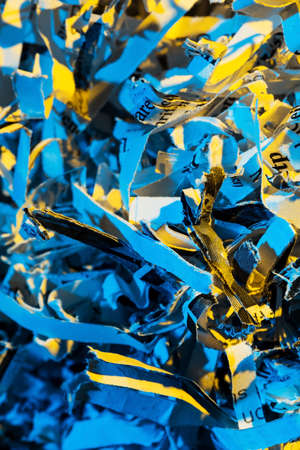 Close up of textured heap of shredded confidential papers with blue