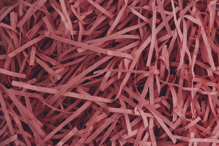 Shredded paper on light orange background. Image toned in Viva Magenta, color of the 2023 year