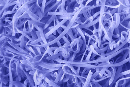 Raw Pasta, spaghetti background toned in Very Peri color - color of year 2022, flat lay.
