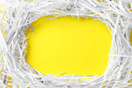 Frame of shredded paper strips on yellow background, flat lay. Space for text
