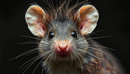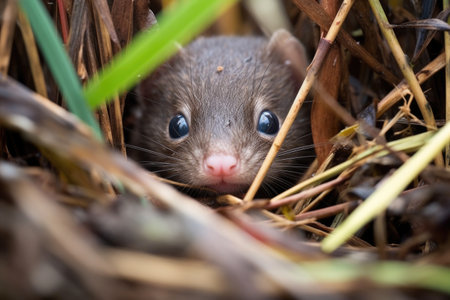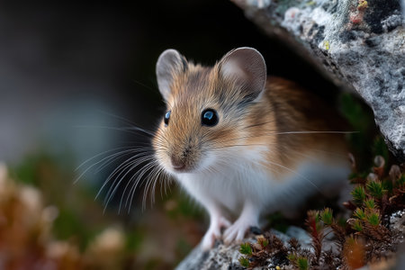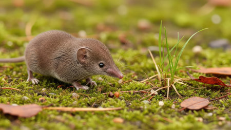an elephant mouse with a red nose is captured in this uhd image, nestled under moss in the norwegian nature. the photograph showcases vignetting, reflections, and mirroring techniques, enhancing the spatial interpretation. the wildlife photography highlights the shiny eyes of the elephant mouse, creating a captivating visual. ai generated