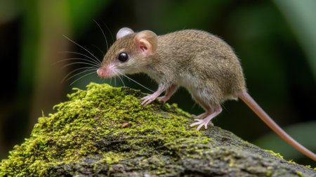 This image features a small mammal on a moss-covered log, highlighting its delicate features and natural surroundings in a vibrant forest.