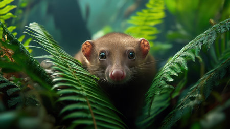 A curious mammal peers through vibrant ferns in a lush green jungle, showcasing the richness of wildlife in its natural habitat. The scene captures the essence of exploration and serenity.