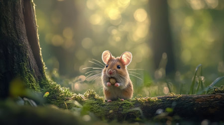 A small, adorable rodent holds a nut in its paws, standing on a moss-covered log within a serene forest. Soft sunlight filters through trees, creating a tranquil woodland scene.