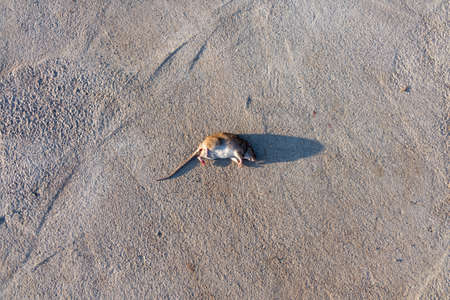 Small dead house mouse lying outside on the driveway near a wall with shallow depth of field