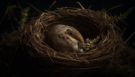 Fluffy newborn rodent hatching in birds nest generated by artificial intelligence