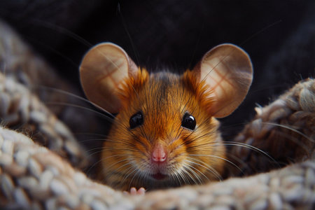 Close-up of a cute mouse with large ears and shiny eyes, nestled in soft fabric, looking curious. Generative AI