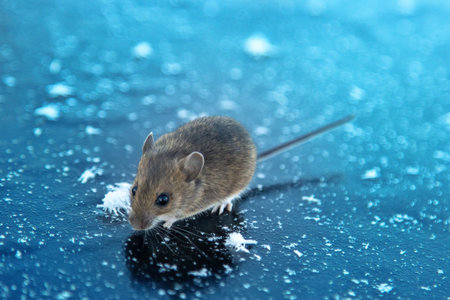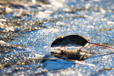 Wood mouse (Apodemus sylvaticus) is freezing on ice during crossing of frozen river. Small animal put its bare tail on head. This special adaptation allows animal to conserve energy. Boreal forest