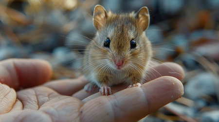 A cozy mouse, whiskers and fur detailed, nestled in a palm, tiny paws and tail depicted realistically.