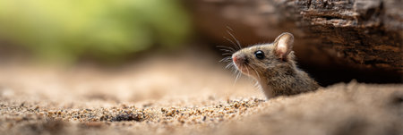 Wild mouse peeking out from its burrow in the sand, observing the surroundings with curiosity. Surrounded by autumn foliage and a piece of wood, this small mammal enjoys its natural habitat