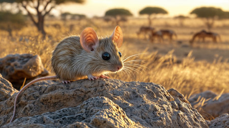 African spiny mouse Thamnomys perched on a rock in a savanna landscape with dry grass, scattered trees, and soft golden light highlighting its natural environment.