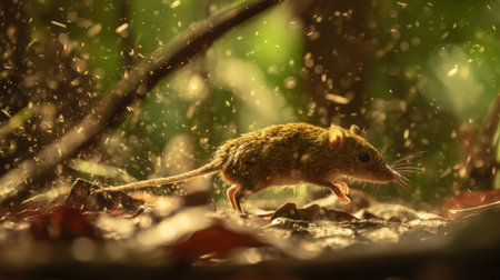 A small mammal scurries across the forest floor in soft, golden sunlight, creating an enchanting scene of nature's delicate beauty and vibrant life.