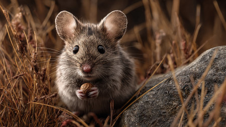 A small mouse sitting on top of a leaf covered ground. AI generative image