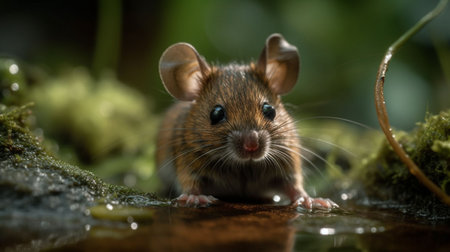 An AI generated illustration of a small wood mouse atop a smooth river rock, illuminated by the natural light of the surrounding environment