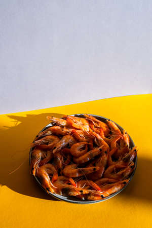 Red shrimps on a gray plate and yellow background. Trendy colors. Minimalistic concept in isometric style