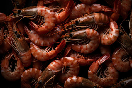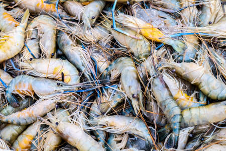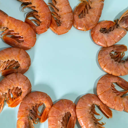 texture of sea prawns top view. Fresh seafood, catching sea animals . copy space