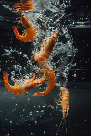 Flying shrimps in water on dark background. Creative design of seafood cooking