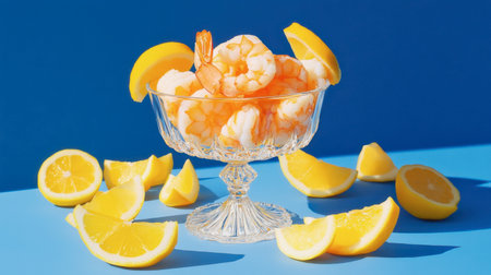 A stunning shrimp cocktail presented in a crystal bowl, surrounded by bright lemon slices, creating a refreshing and vibrant dish perfect for summer gatherings.