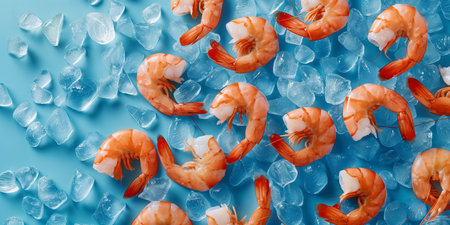 shrimps are laid on a bed of ice against a blue background. The mood is fresh and appetizing, ideal for themes of seafood, culinary preparation, and freshness. Copy space