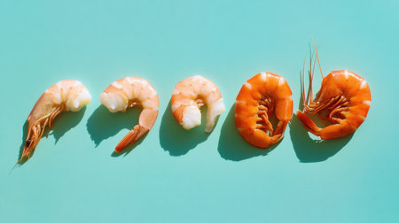 A captivating arrangement of shrimp in various sizes and colors set against a light blue background. This vibrant display is ideal for culinary inspiration and food photography.