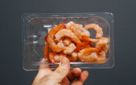 Man hand POV at fresh decorticated shrimps in the plastic package - isolated on gray background