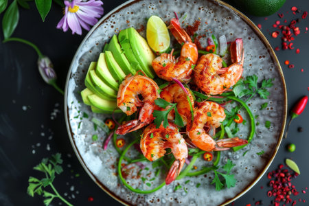 King Prawns, Tiger Shrimps with Avocado Tartare, Sweet Chili under Lime Juice Foam Top View on Dark Background, Generative AI Illustration
