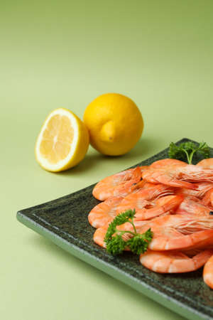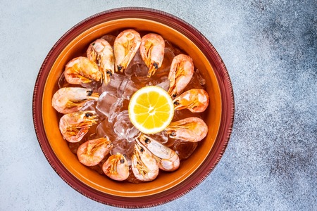 Fresh shrimps on plate plastic tray with lemon spices and herbs, boiled shrimp prawns cooking food in the seafood restaurant - top view