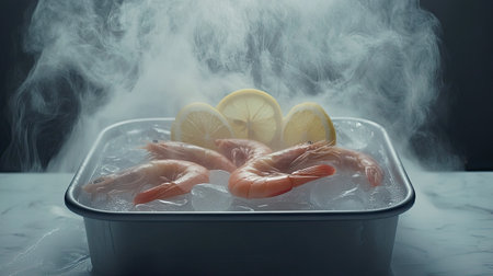 A stunning display of fresh shrimp arranged on ice, accented by lemon slices, and enveloped in steam. Perfect for seafood lovers and culinary enthusiasts.