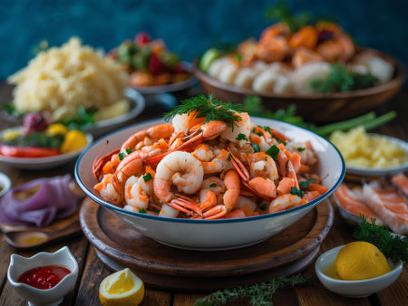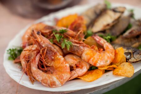tasty meal with fresh and healthy prawn salad and vegetables. Prawns Langostino Austral. shrimp seafood with lemon and spices