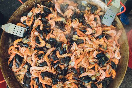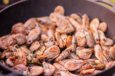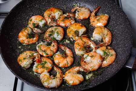 Shrimps are fried in a pan on a grill. Cooking shrimp with spices