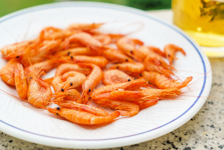 Thawed boiled shrimp prawns lobster are on a white plate. Raw small pink shrimp in shell with head and tail, shell food ingredient prefabricated