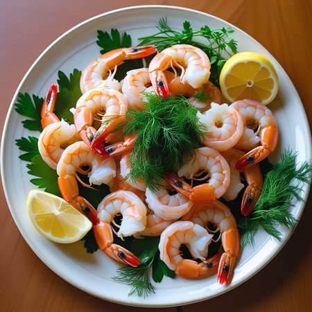 A vibrant shrimp dish adorned with fresh herbs and cherry tomatoes, beautifully arranged on a rustic table, perfect for a summer gathering or special occasion.