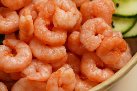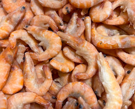 Cooked shrimp close-up. Fresh seafood. Shrimp background. Top view, flat lay