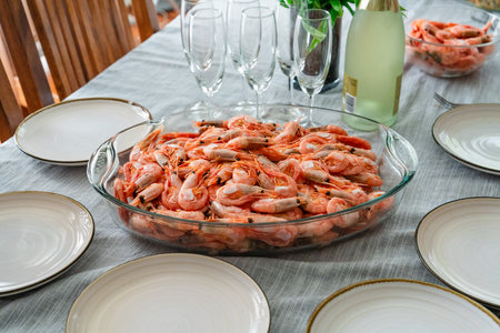 A dish of unpeeled shrimp on a dinner table with plates. Seafood diner. Boiled shrimps.