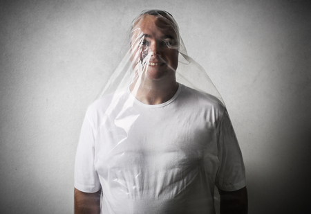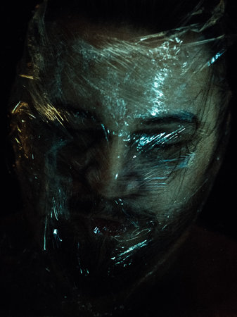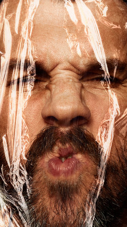 Close-up of male face wrapped in plastic cover. Man with moustaches expressing funny face with eyes closed. Conceptual photography.