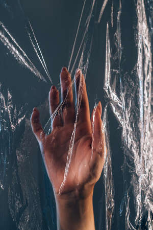 Domestic violence. Defocused art portrait. Female rights. Social isolation. Scared trapped woman looking through transparent wrinkled texture polyethylene film on gray background out of focus.