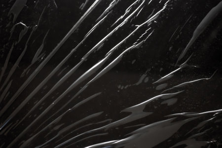 Reflecting light and shadow on creases and folds in scrunched clear plastic foil on black background. monochrome light and texture, abstract background image.