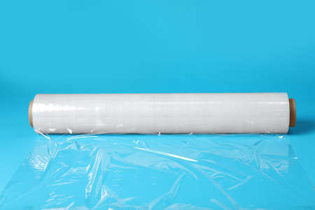 hand hold a large roll of wound white transparent film for wrapping food, top view, blue background