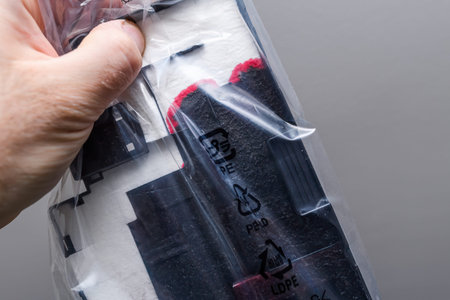Close-up of a used printer maintenance cartridge sealed in a plastic bag, showing visible ink and recycling symbols on the packaging