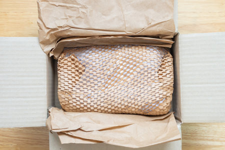 goods wrapped with bubble sheet and red ribbon put into carton package for parcel